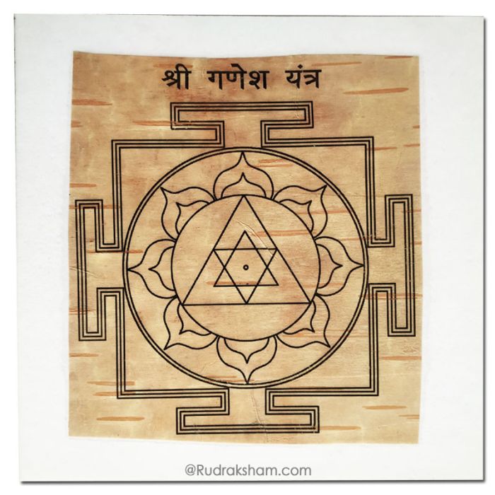 Ganesh Puja Yantra on Bhoj Patra. Ganesha is the foremost God. This is a very powerful Yantra of Lord Ganesha. Ganesha is known as the son of the Lord Shiva and Goddess Parvati, and is always honored first in most worship services and rituals. It is most auspicious Yantra. Lord Ganesha is worshipped before any venture is started. He is worshipped for success in undertakings. The virtues of Ganesha have been narrated widely in all the Vedas and Puranas.